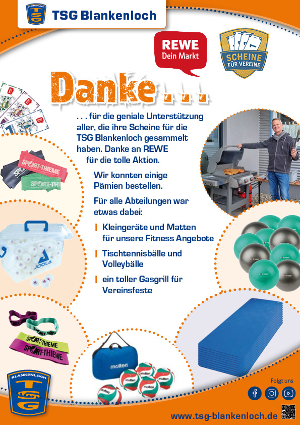 - Die Webseite - www.rewe.de/scheinefürvereine - aufrufen, die TSG Blankenloch auswählen, den Code auf dem Vereinsschein eingeben und gutschreiben.