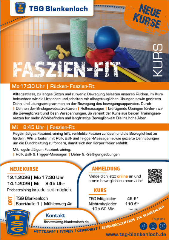 Faszien-Fit-Kurs bei der TSG Blankenloch Regelmäßiges Faszientraining hilft, verklebte Faszien zu lösen und die Beweglichkeit zu fördern. Wir arbeiten mit Roll-, Ball- und Trigger-Massagen sowie gezielte Dehnübungen um die Durchblutung zu fördern , damit sich der Körper freier anfühlt. Ab dem 15. Oktober 2025 startet unser neuer Kurs mit 10 Einheiten à 60 Minuten, immer mittwochs um 8:45 Uhr in der TSG Halle. Zum Kennenlernen laden wir am 24. September 2025 zu einem kostenlosen Probetraining ein.