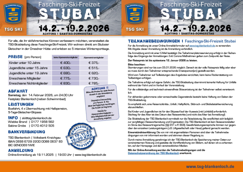 Die Teilnahme erfolgt auf eigene Gefahr, die TSG-Skiabteilung übernimmt keinerlei Haftung für Unfälle während der Fahrt und im Verlauf der Veranstaltung.