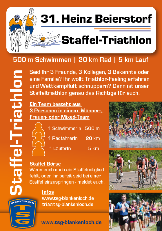 Die Triathlon-Staffel ist ein toller Einstieg für Sportler, Vereine, Firmen, Freunde oder Familien um den Wettkampf als Team zu meistern. Ein Team besteht aus drei Personen, wobei je eine Disziplin von einer Person absolviert wird.